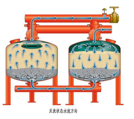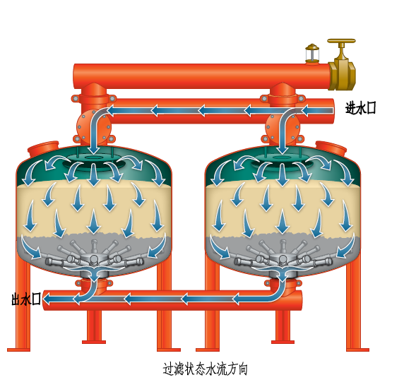 當系統處于過(guò)濾狀態(tài)時(shí),未經(jīng)過(guò)濾的水通過(guò)布水器均勻布水,水以層流狀態(tài)通過(guò)過(guò)濾器內的填料層(精制均粒石英砂、石榴石)。當水經(jīng)過(guò)填料層時(shí),雜質(zhì)被截留在填料層內。過(guò)濾器底部有多個(gè)均勻分布的集水器,將過(guò)濾后的水均勻地收集并引出,平流過(guò)濾,可以使過(guò)濾器在高流速下過(guò)濾,仍可達到較好過(guò)濾的效果。